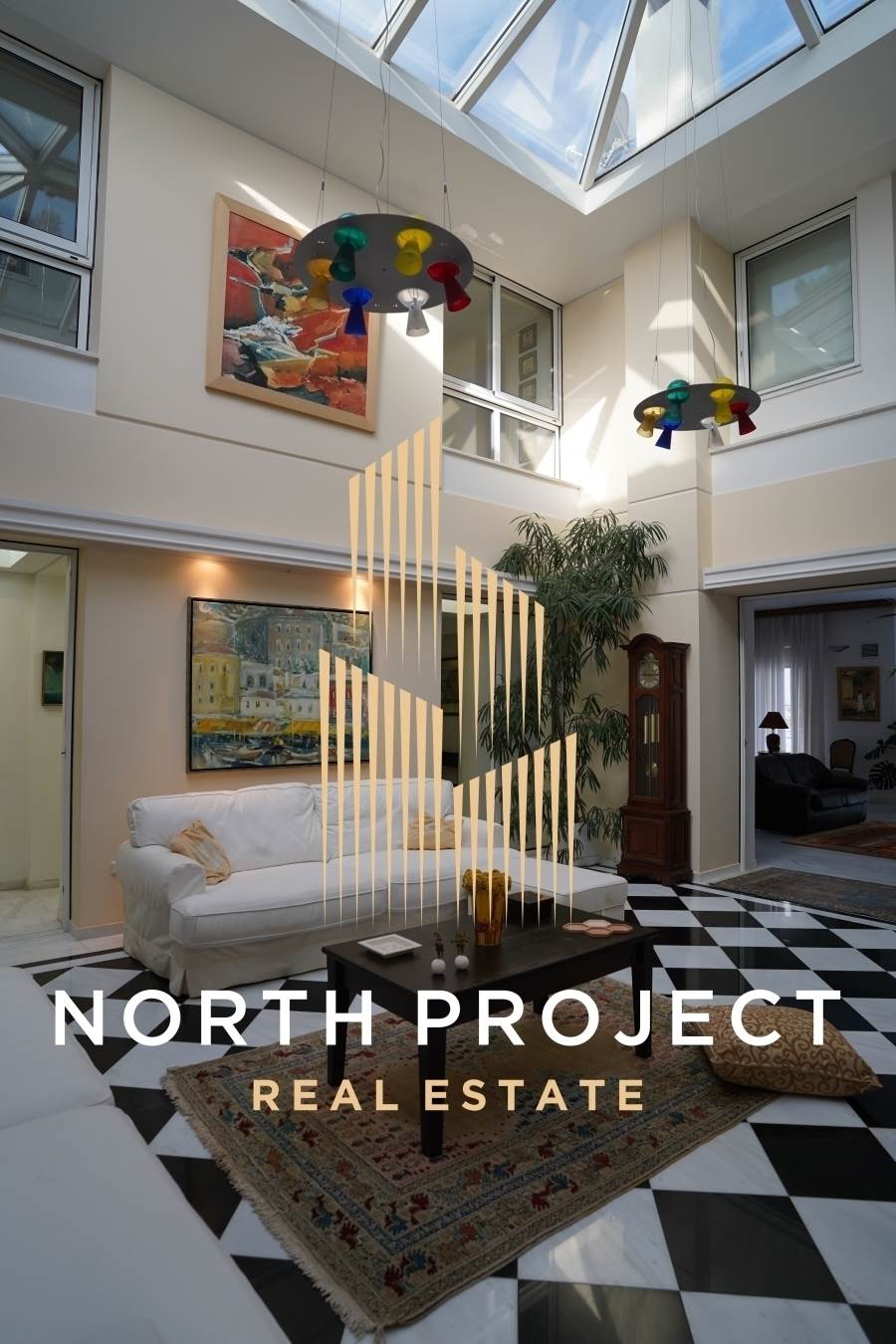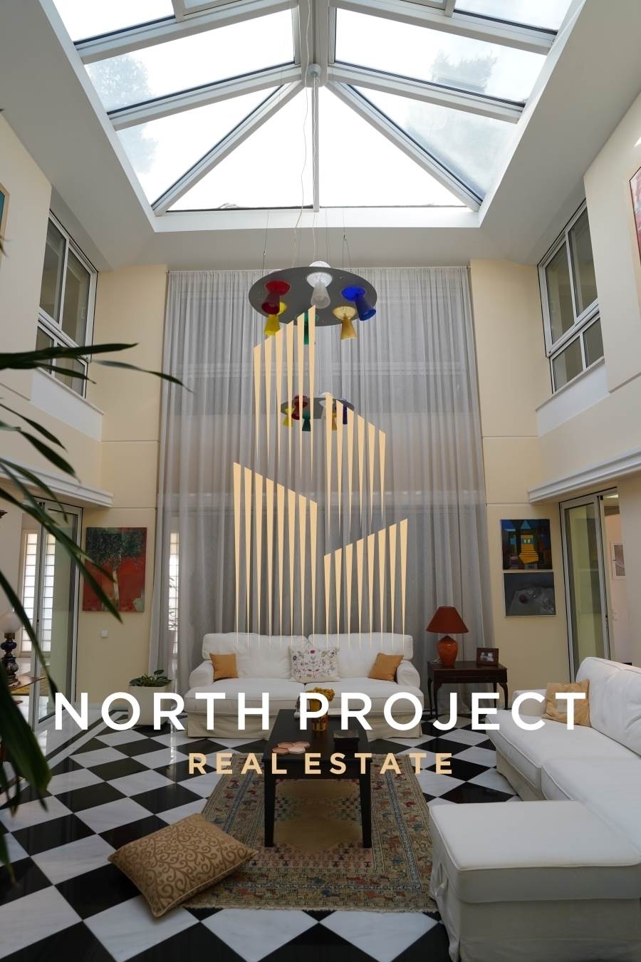 Το ακίνητο έχει μια ιδιαίτερη αρχιτεκτονική καθώς είναι ιδιαίτερα φωτεινό λόγω των μεγάλων ανοιγμάτων. Στο κέντρο του σαλονιού δεσπόζει γυάλινη οροφή με ανάκλιση.